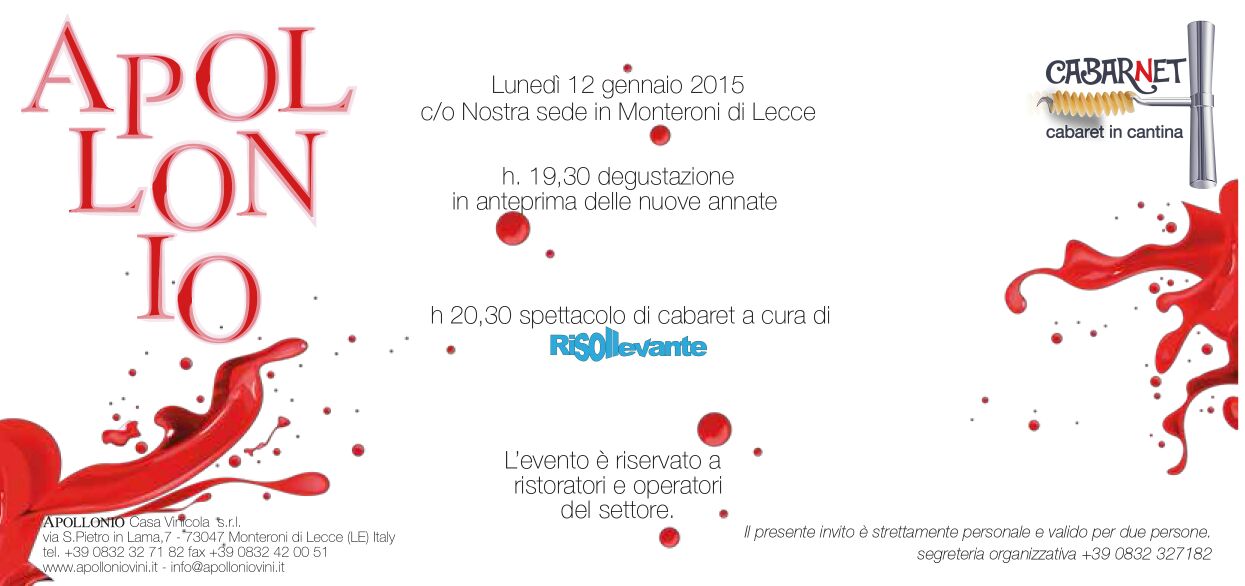 E’ il Salento la prima tappa della rassegna“CABARnET – Cabaret in Cantina”, ideata e prodotta dall’associazione culturale“Sirio”con il patrocinio della Regione Puglia – Area Politiche per lo Sviluppo Rurale nell’ambito della promozione del marchio “Prodotti di qualità Puglia”, in collaborazione conApollonio Casa Vinicola (Monteroni), Cantina Vinicola Torrevento (Corato), azienda vitivinicola Varvaglione “Vigne & Vini” (Leporano) […]